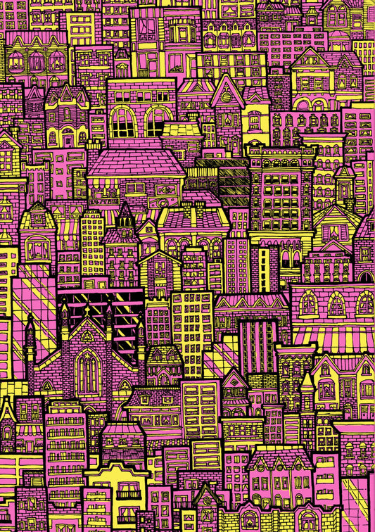 The line-work of each illustration is drawn by hand, scanned and rendered digitally. Each piece takes approximately 4 months to complete. Buildings are chosen based on aesthetic, their contents and their influence within the city.